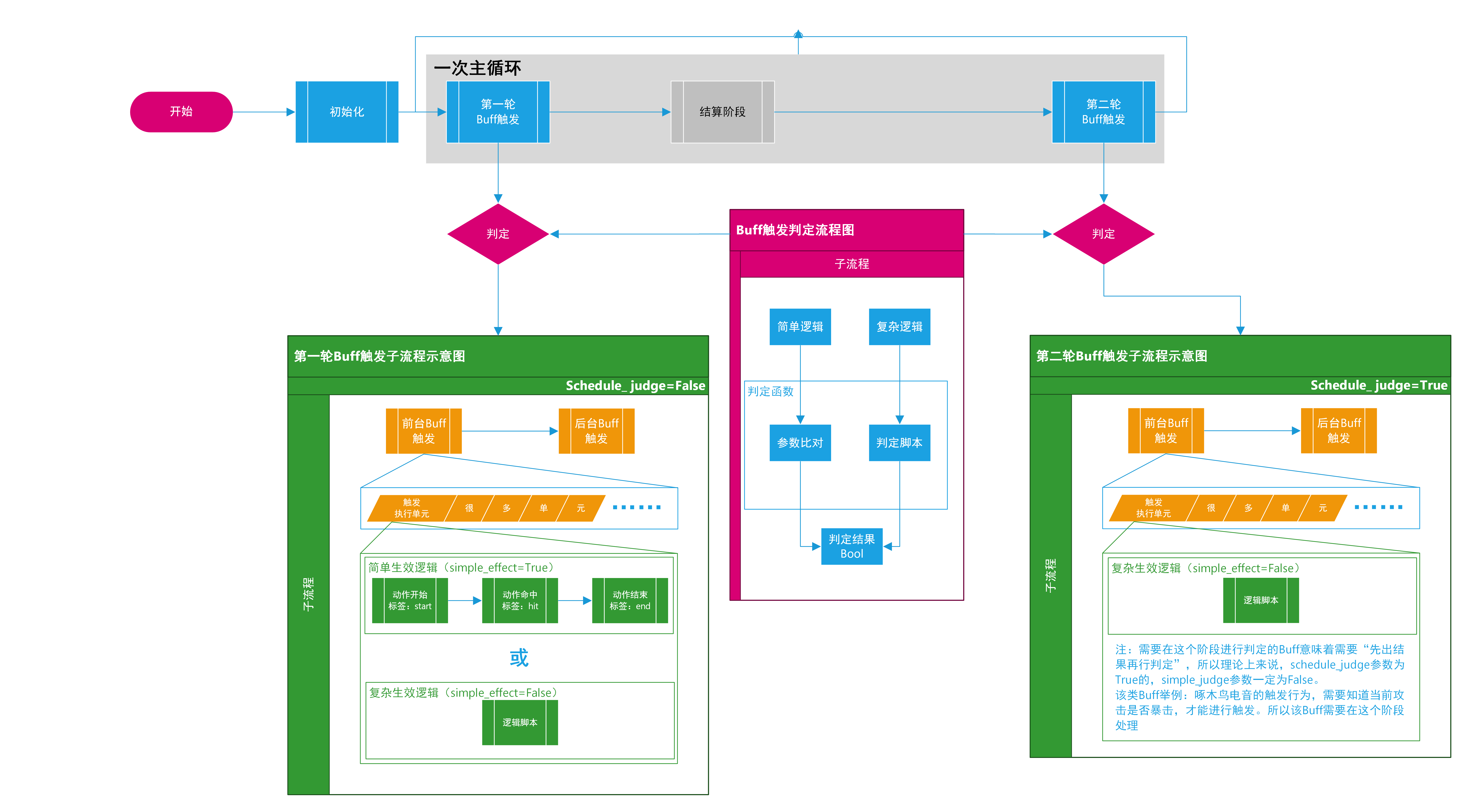 上图即为仿真程序在一个tick(模拟实战中的1帧)内的Buff判定以及触发流程。根据Buff的自身逻辑,分为1、2两轮。两轮的结构与原理大致相同。