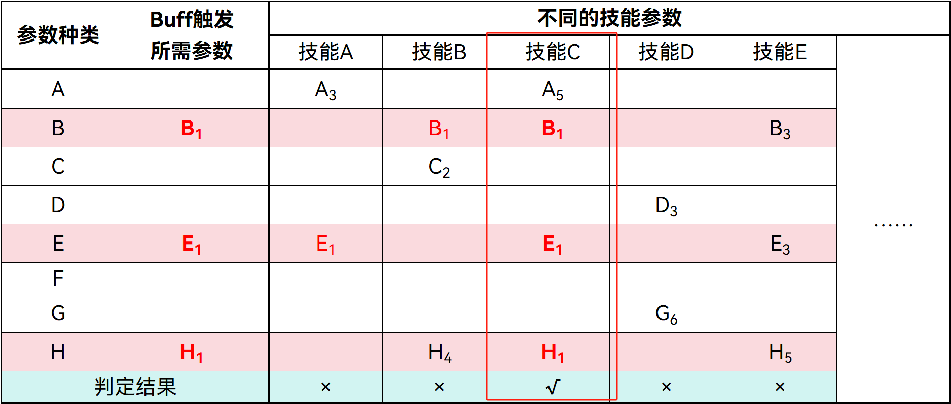 从上图不难看出,Buff的触发条个数往往是比较少的,而技能的特定参数只要等于触发条件,那么就可以让技能通过判断。